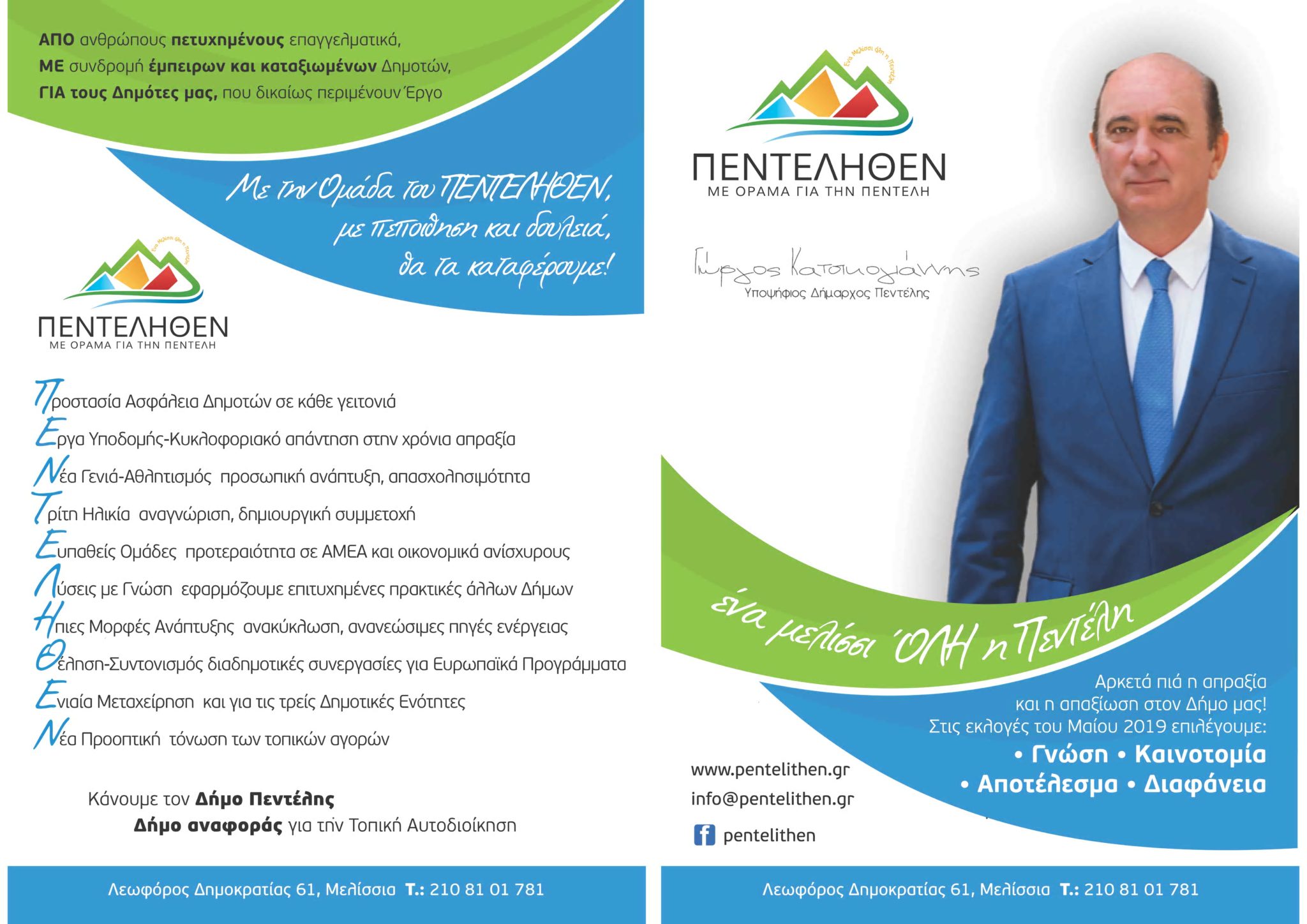 Να αναδείξουμε το Δήμο Πεντέλης σε σύγχρονο Δήμο με καινοτόμες ιδέες και νέες πρακτικές, μέσα από μια δυναμική συνεργασία, παρέχοντας στους συμπολίτες μας ποιότητα ζωής και καθιστώντας τον ως πρότυπο δήμο της χώρας μας.