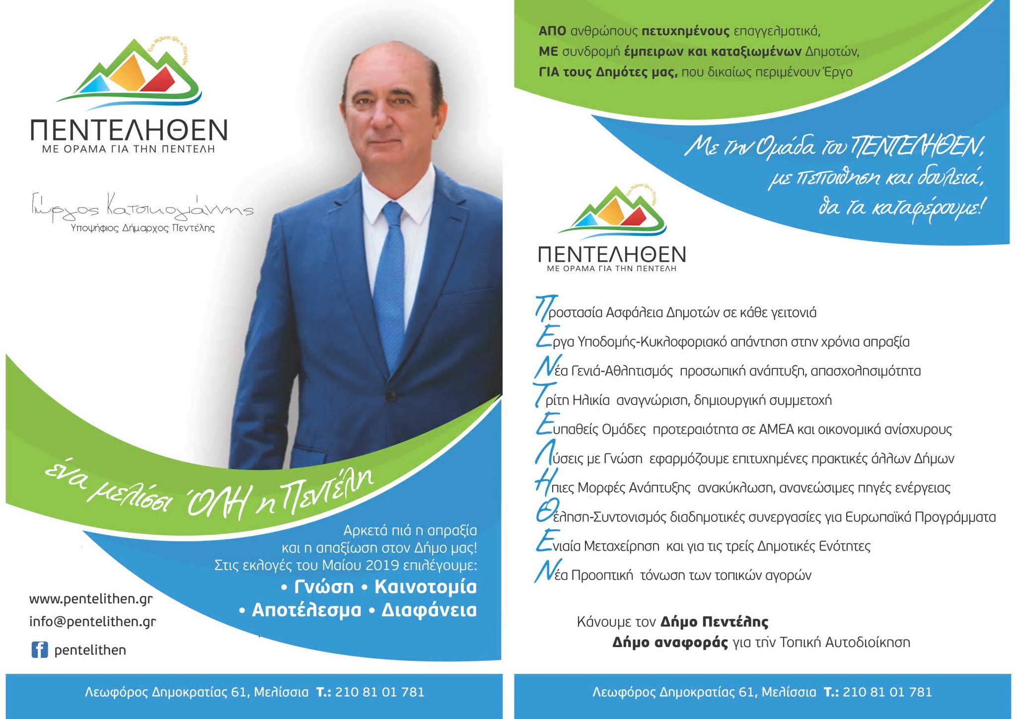 Ξεκίνησε δυναμικά από το Σάββατο η διανομή του πρώτου ενημερωτικού έντυπου – flyer στους κατοίκους της πόλης μας, από τον υποψήφιο Δήμαρχο Πεντέλης Γιώργο Κατσικογιάννη και στελέχη της Κίνησης «ΠΕΝΤΕΛΗΘΕΝ».