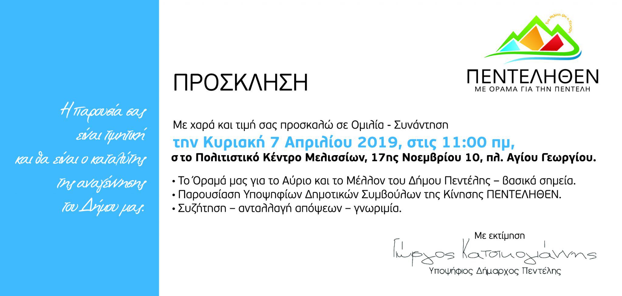 Ο υποψήφιος Δήμαρχος Πεντέλης Γιώργος Κατσικογιάννης διοργανώνει εκδήλωση στο πλαίσιο της πορείας προς τις Δημοτικές Εκλογές την Κυριακή 7 Απριλίου στις 11:00 πμ, στο Πολιτιστικό Κέντρο Μελισσίων, 17ης...