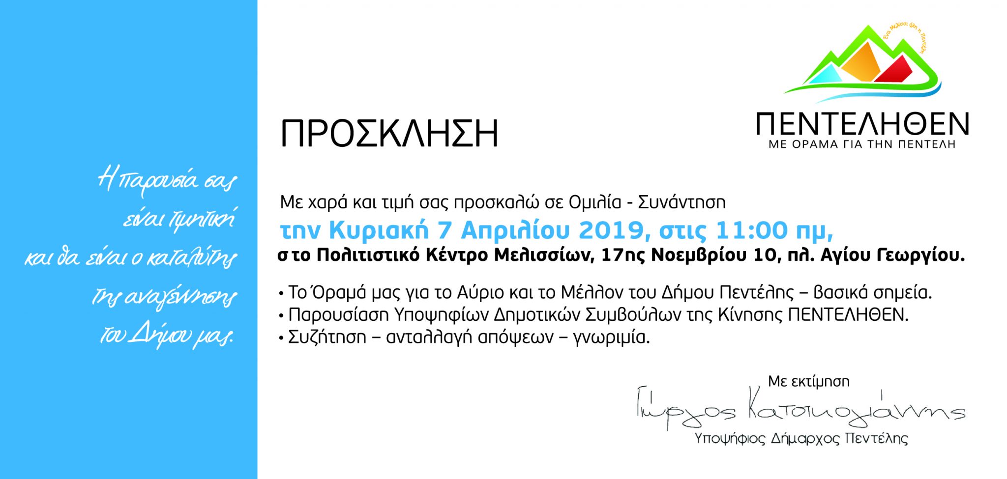 Ο υποψήφιος Δήμαρχος Πεντέλης Γιώργος Κατσικογιάννης διοργανώνει εκδήλωση στο πλαίσιο της πορείας προς τις Δημοτικές Εκλογές την Κυριακή 7 Απριλίου στις 11:00 πμ, στο Πολιτιστικό Κέντρο...