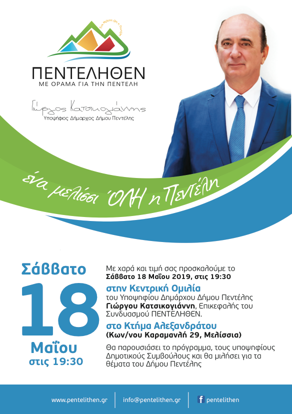 Ο Υποψήφιος Δήμαρχος Πεντέλης Γιώργος Κατσικογιάννης ανακοίνωσε την πραγματοποίηση της τρίτης Κεντρικής Ομιλίας της Κίνησης ΠΕΝΤΕΛΗΘΕΝ, στην πορεία για τις εκλογές.